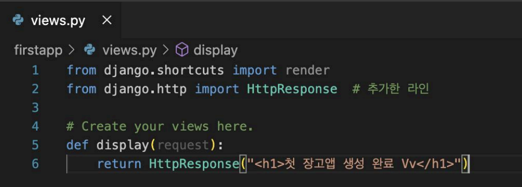 - 출력할 화면을 앱 폴더 내부의 views.py에 작성